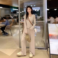 這套搭配是休閒風格的套裝。上衣是帶有連帽設計的長袖款,內搭淺色衣物,增添了層次感;下裝是寬鬆的闊腿褲,整體以深灰色為主,穿起來既舒適又顯得時尚大方,很適合日常休閒穿搭。